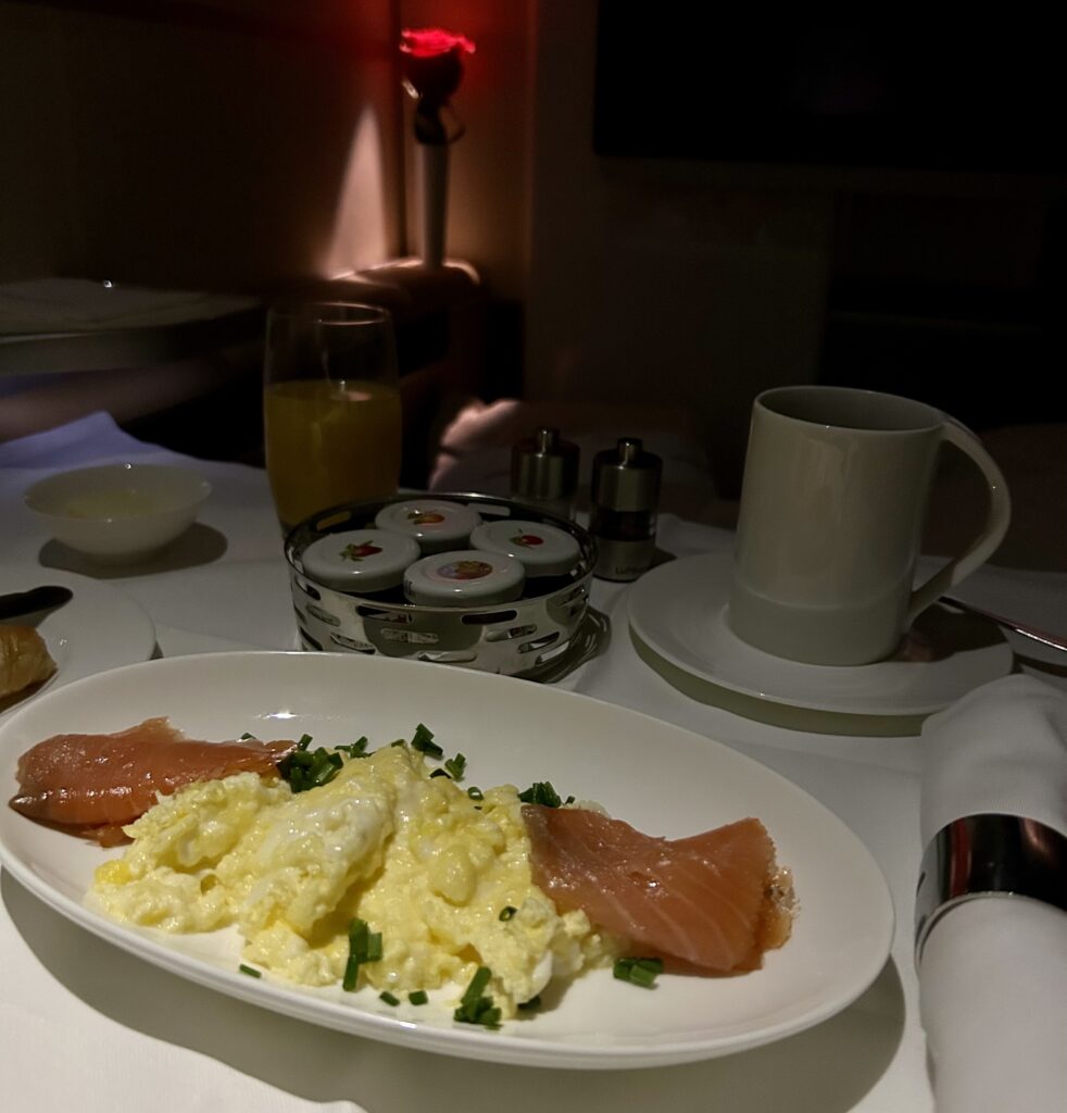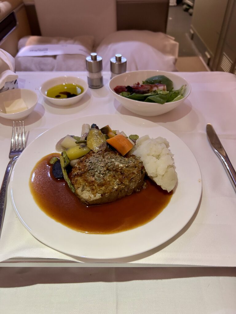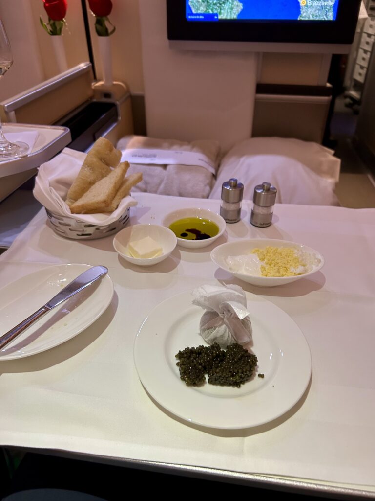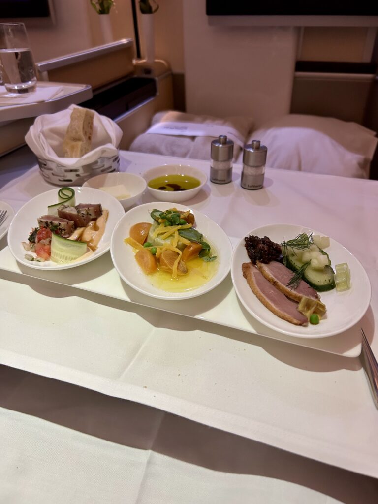 This is where Lufthansa’s heritage truly shines. The dinner service began with an amuse bouche and a glass of champagne, followed by the airline’s signature caviar service – beautifully presented with traditional garnishes. For many, this alone justifies the First Class indulgence.