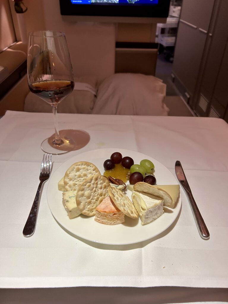Dessert came in the form of a cheese plate and a glass of port wine – a fitting end to a two-hour dining experience. The wine list features two champagnes, four whites, and four reds, ranging from €20 to €100 retail, alongside Lufthansa’s own Avionic signature cocktail. Personally, I enjoyed the Grüner Veltliner with my starters and a Super Tuscan with the main – both excellent pairings.