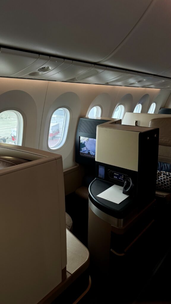 On the 787, the staggered configuration means window seats and aisle seats are genuinely different products. Our aisle-adjacent seats felt spacious and private — the moveable shoulder divider is one of those understated features you appreciate once you’ve used it. The electric terminal controls everything: lighting, shades, seat position, IFE. It’s intuitive. At 195cm, turning inward to sleep means your knees eventually meet the side wall — manageable, but worth knowing if you’re tall and light-sleeping.