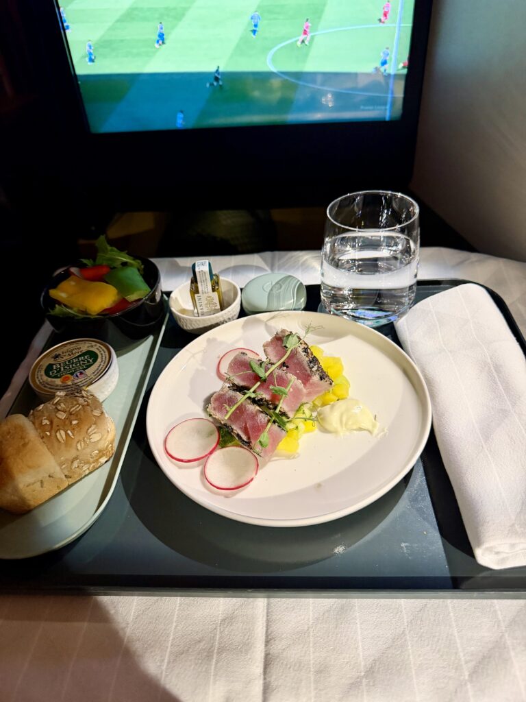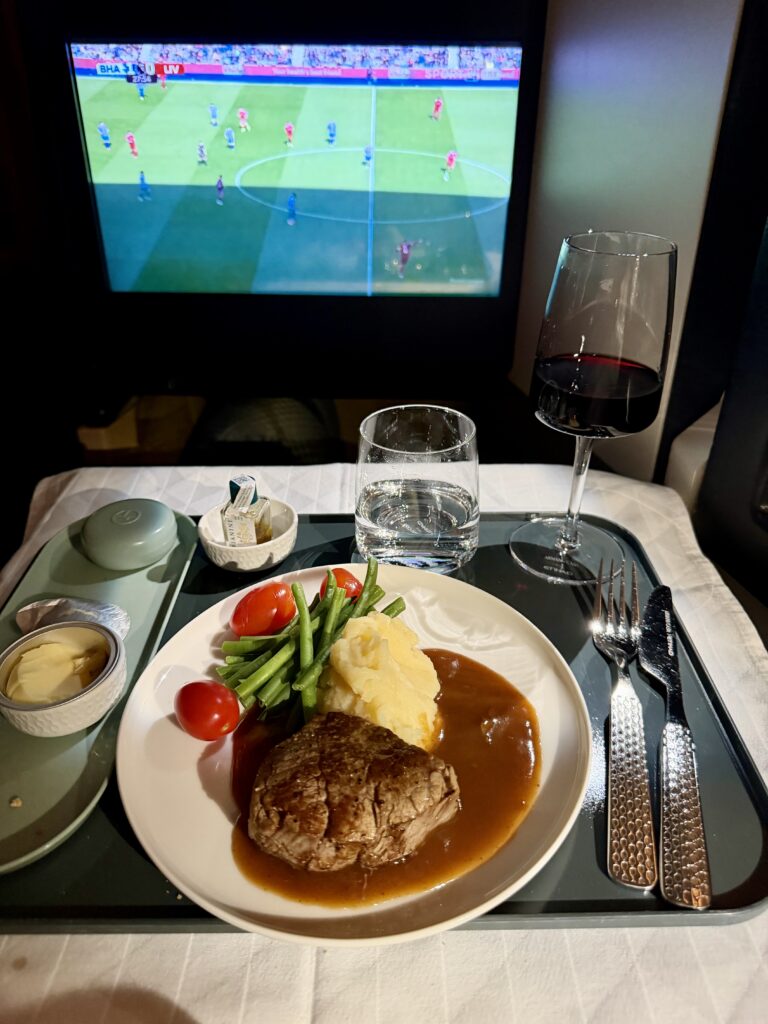 Etihad has live TV across its business class fleet, which I would normally note and not particularly care about. On this flight, eating perfectly cooked beef tenderloin at 38,000 feet while watching Premier League live is a specific experience that’s worth naming. It’s the kind of thing that pulls your attention when you’d normally have it on a film or podcast.