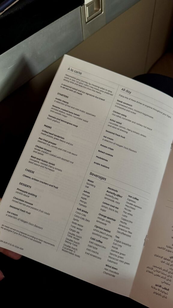 There was one inconsistency. Pajamas and slippers were not proactively offered on either leg. On the first flight, we asked and received them without any issue. We then reused the same pair on the second leg. Still, at this level, that feels like a miss. Competing Gulf carriers often distribute them before takeoff, even on shorter sectors.