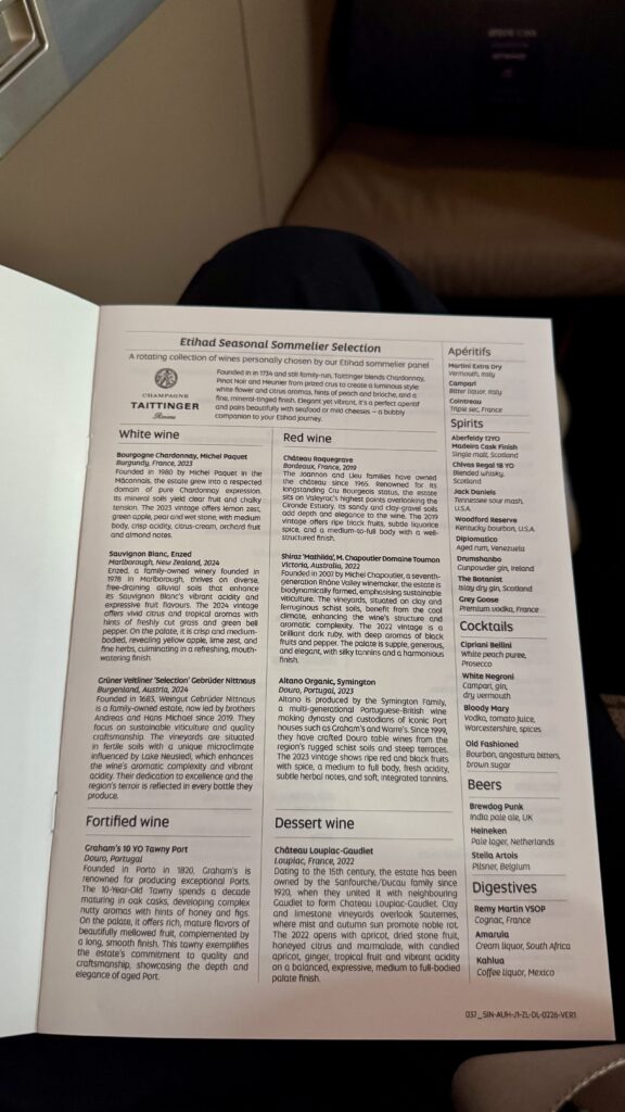 Etihad operates a rotating Sommelier Selection rather than a fixed list, and the curation is serious. On this routing: Taittinger on arrival, a Bourgogne Chardonnay from Michel Paquet and a Marlborough Sauvignon Blanc from Enzed among the whites, a Grüner Veltliner from Weingut Gebrüder Nittnaus (Burgenland) as an interesting addition, a Château Roquegrave Bordeaux 2019 and a biodynamic Shiraz from M. Chapoutier’s Tournon estate among the reds, Altano Organic from the Symington family as an additional red option, and Graham’s 10-Year Tawny alongside a Château Loupiac-Gaudiet as dessert and fortified options. The spirits list runs from Aberfeldy 12YO Madeira Cask through to The Botanist gin and Diplomatico rum. Cocktails include an Old Fashioned, White Negroni, Bloody Mary, and Cipriani Bellini.
