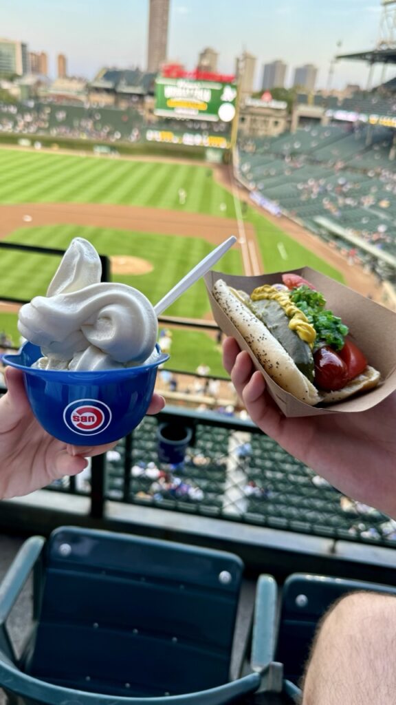 We caught a Chicago Cubs game at the legendary Wrigley Field, and the experience was pure Americana. Opened in 1914, it’s one of the oldest ballparks in the nation, and you can feel the history. From its iconic ivy-covered outfield walls to the manual scoreboard, it’s a trip back in time. The atmosphere was electric. We grabbed a classic hot dog and a helmet-shaped ice cream cup. We booked seats in the upper ranks, which offered a fantastic view and were great value.