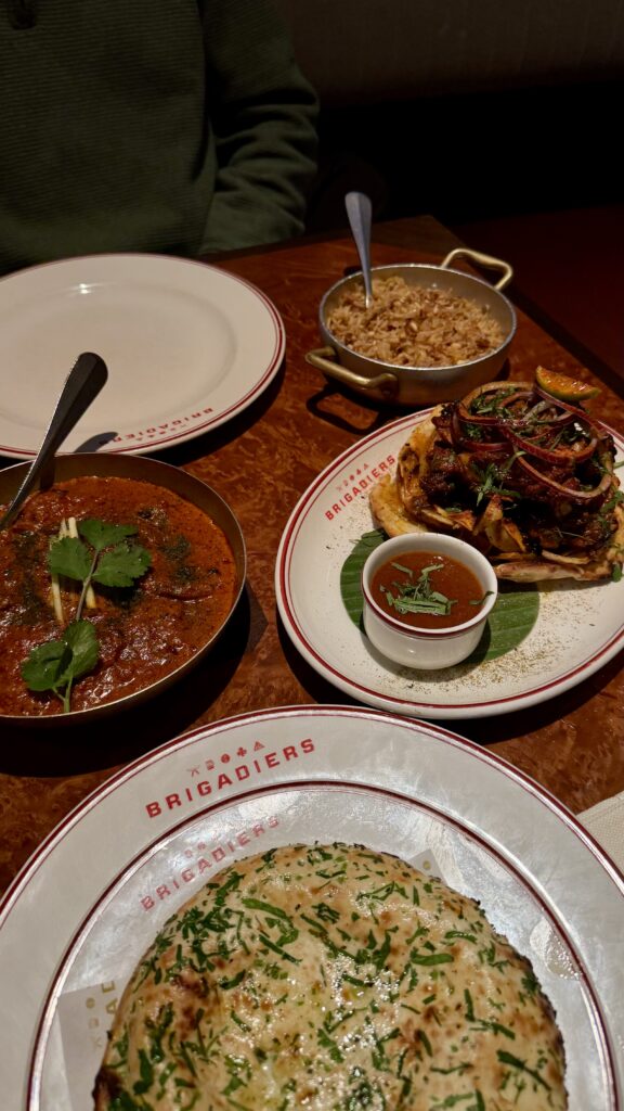 Brigadiers was exactly the kind of first-night place you want after a full day of walking. It’s warm, busy, a little loud, and feels like it’s built for sharing plates in the middle of the table. We ordered the chicken tikka masala, lamb, and basically everything you see in the photo — the kind of meal where you keep saying “okay, one more thing.”